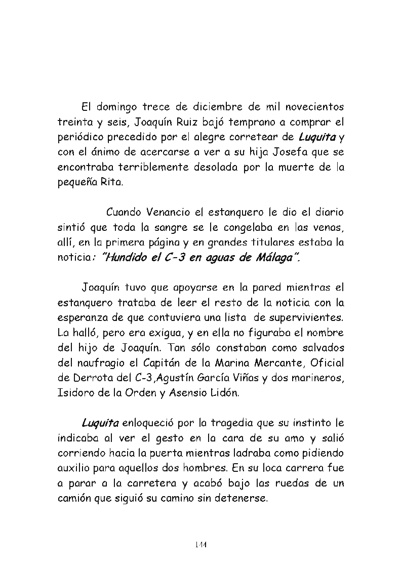 Soy Rita Campillo Ruiz, sobrina de Joaquín Ruiz Baeza – Cabo de electricidad y torpedos- del Submarino C-3 hundido en aguas de la bahía de Málaga el día doce de diciembre de mil novecientos treinta y seis por un submarino alemán, el U-34, en un acto de piratería propiciado por una misión que haría enrojecer a cualquier militar de honor.