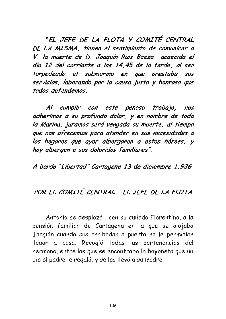 Soy Rita Campillo Ruiz, sobrina de Joaquín Ruiz Baeza – Cabo de electricidad y torpedos- del Submarino C-3 hundido en aguas de la bahía de Málaga el día doce de diciembre de mil novecientos treinta y seis por un submarino alemán, el U-34, en un acto de piratería propiciado por una misión que haría enrojecer a cualquier militar de honor.