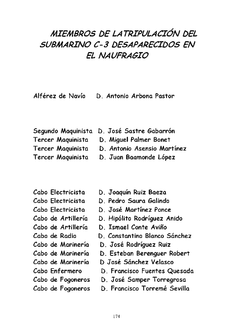 En febrero del año dos mil tres, la Universidad Politécnica de Valencia me publicó un libro que escribí en memoria de los treinta y siete marinos desaparecidos con el C-3 y que, tras sesenta y dos años de olvido, en mil novecientos noventa y ocho, volvía a cobrar vida y “conquistó de nuevo el derecho a tener un lugar concreto bajo las estrellas : [ N 36º 39´ 52,5´´ W 4º 21´33,5´´]” según las palabras de Antonio Polo.