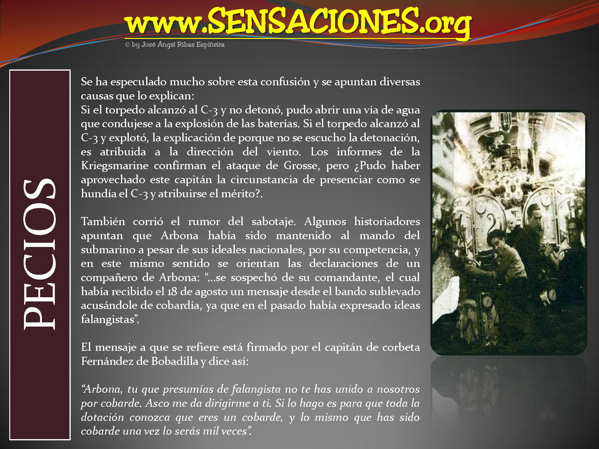 Artículo publicado en el número 19 de Abril de 2009 de la revista "SENSACIONES" sobre el Submarino C3. www.sensaciones.org Agradecemos sinceramente a la direccion de esta revista la colaboracion prestada. |Article published in Issue 19 April 2009 in the journal "SENSACIONES" about the submarine C3. www.sensaciones.org We sincerely thank the leadership of this journal for their collaboration.